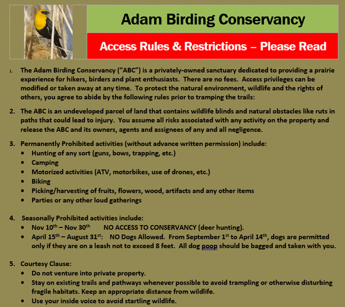 The Adam Birding Conservancy ("ABC") is on private land, most of which has a permanent easement established by the Natural Resources Conservation Service (the "NRCS") of the US Dept. of Agriculture. The NRCS dictates some do's and don'ts. In addition, we want to maintain good relations with the neighbors and the preservation partnerships that have been established in an effort to enhance the property for the enjoyment of all - people, wildlife, plants and trees.